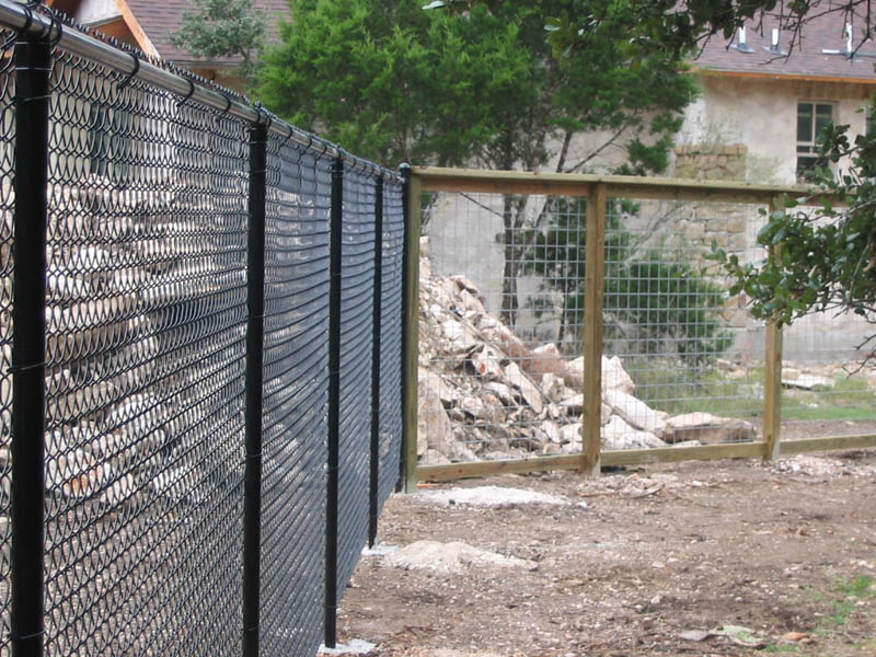 Chain link fencing normally comes in three different sizes – 4, 6, and 10 feet. The most common size in Austin being four feet. Chain link is also referred to as wire-mesh fencing. It is a metal fence made from galvanized or coated steel wire. Newer types include black chain link fencing. Chain link fences are also commonly used commercially for dog kennels and basketball courts.